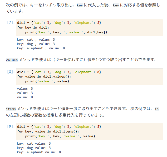 for key in dic1:→ キーだけ取り出す。値はdic1[key]で参照。for key, value in dic1.items():→ キーと値を同時に取り出せる。