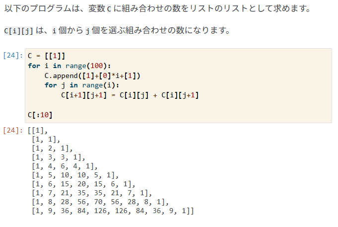 このコードは パスカルの三角形 をリストのリスト(2次元配列)として作成する処理です。