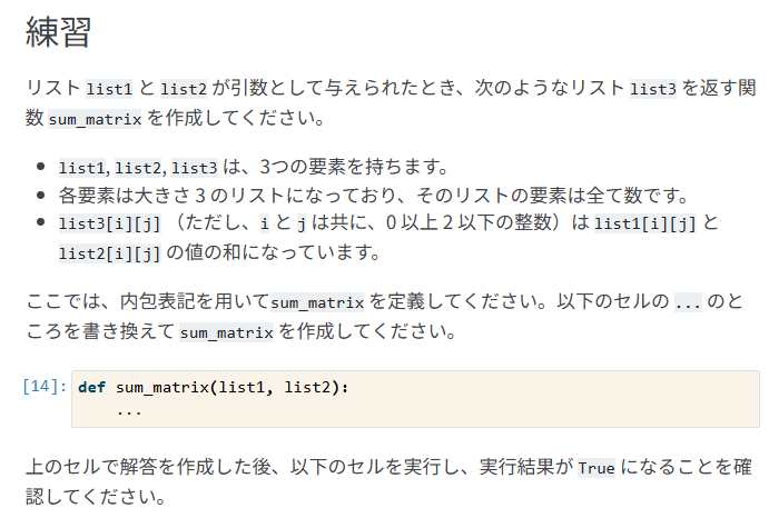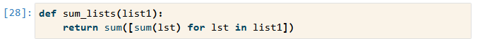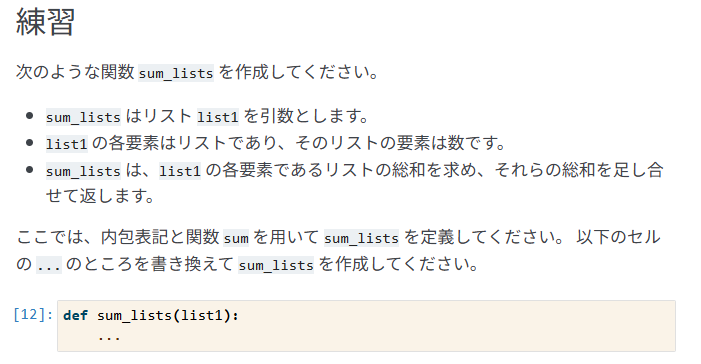 これの模範解答は以下でした。こちらが正しいですね。私の解答はリストの要素の全ての数の総和ですが、問題文は「リストの総和を求め、それらの総和を足し合わせて」でした。これを見落としていたため、不正解になります。